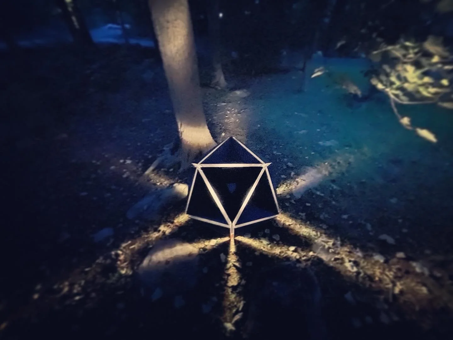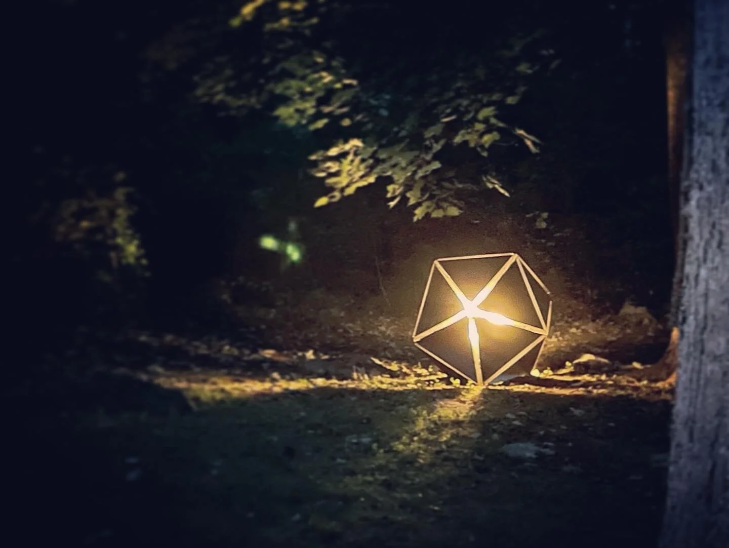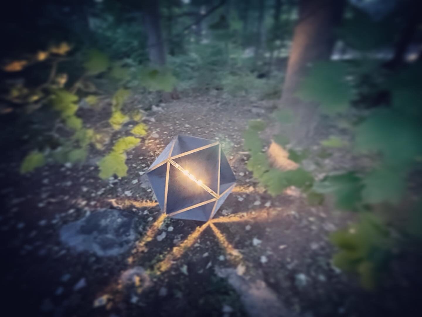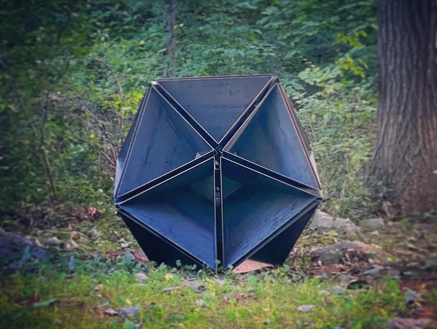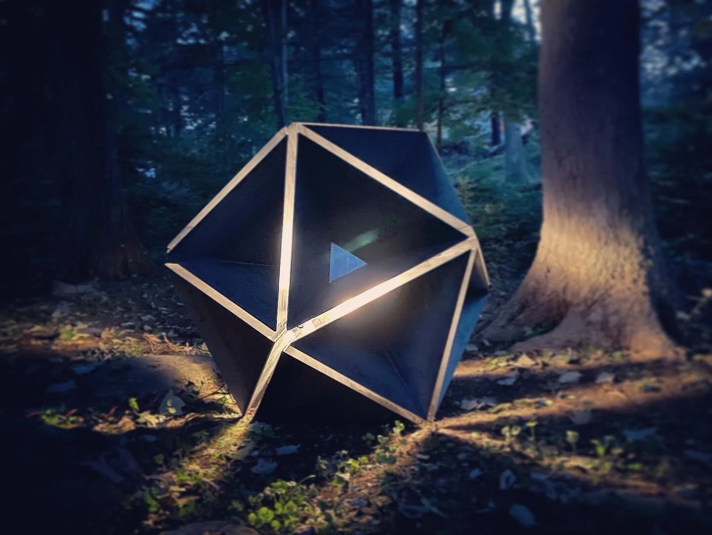 A large geometric sculpture made of 10ga Cor-Ten steel. Custom lighting element installed in the center to create a play of light and shadow on the surrounding grounds at night.